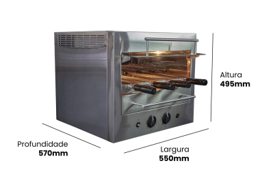 Possui grelha em aço com acabamento cromado: gratine pizzas, carnes e outros alimentos.